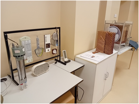 Stanowisko do badań klimatyzatorów wyparnych wraz z wentylatorem, układem dystrybucji wody, różnymi konfiguracjami żaluzji i padów ewaporacyjnych oraz dwoma termohigrometrami: DeltaOhm HD 2301.1 oraz DeltaOhm HD 2101.1 wraz z sondą.